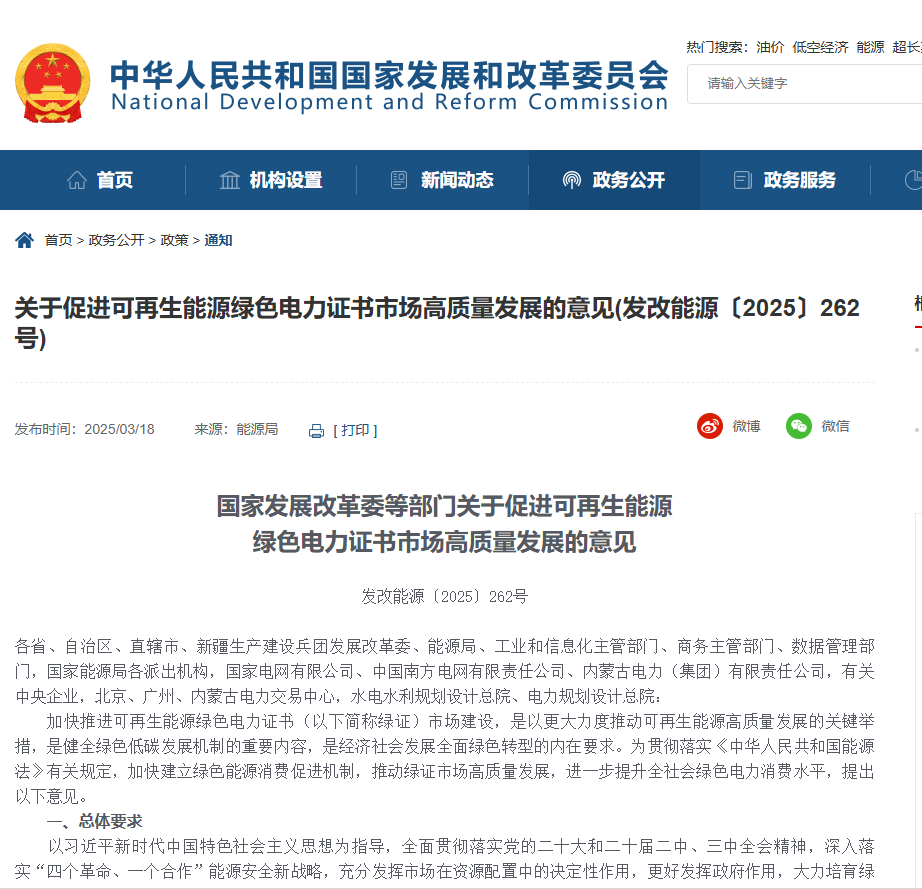 关于促进可再生能源绿色电力证书市场高质量发展的意见(发改能源〔2025〕262号)